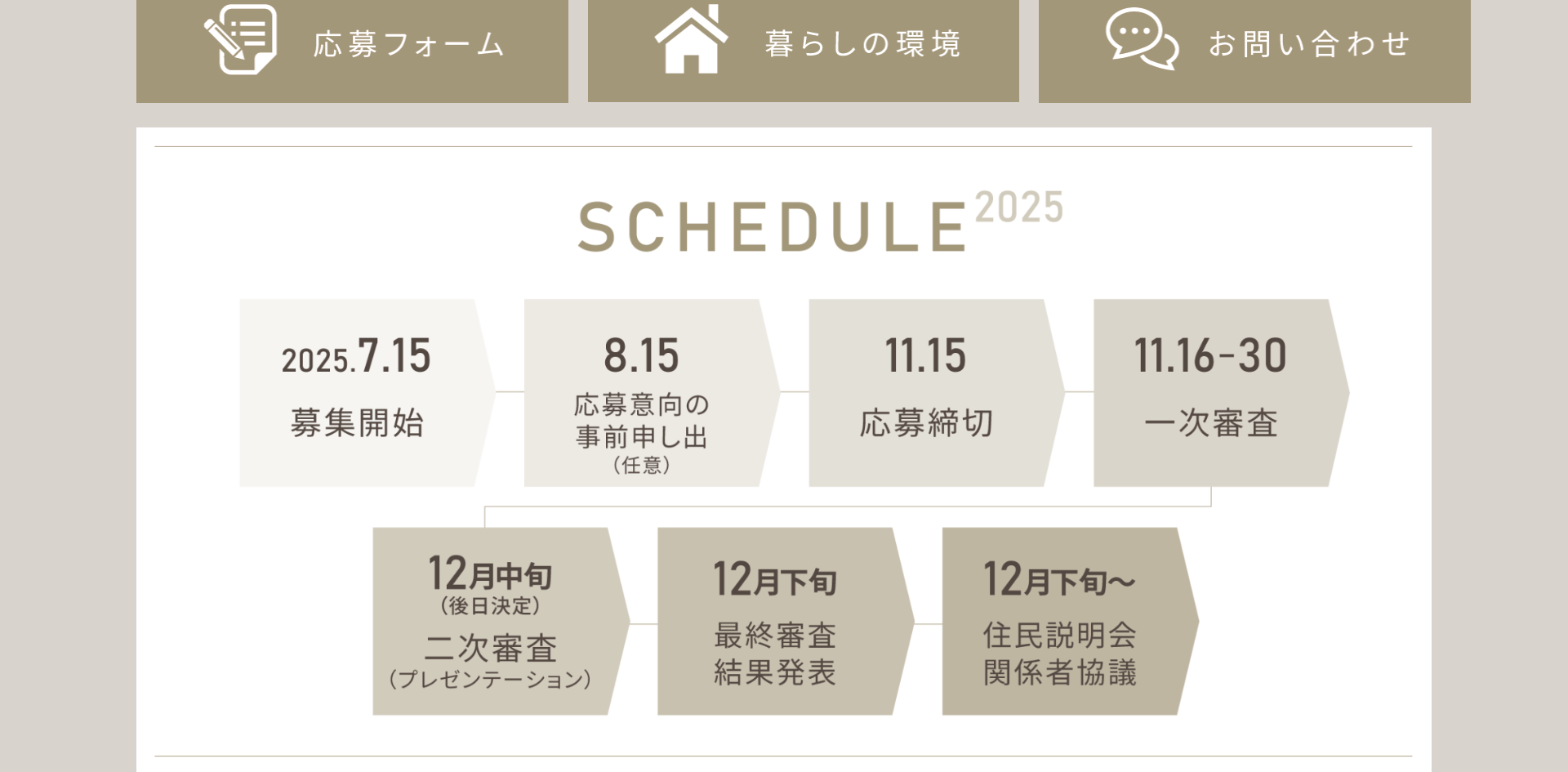 建替コンペを開催するにあたり、Hirameki7で申込フォーム付きホームページを作成し、住民参加や広報、応募受付を効率的に行える仕組みを整えました。