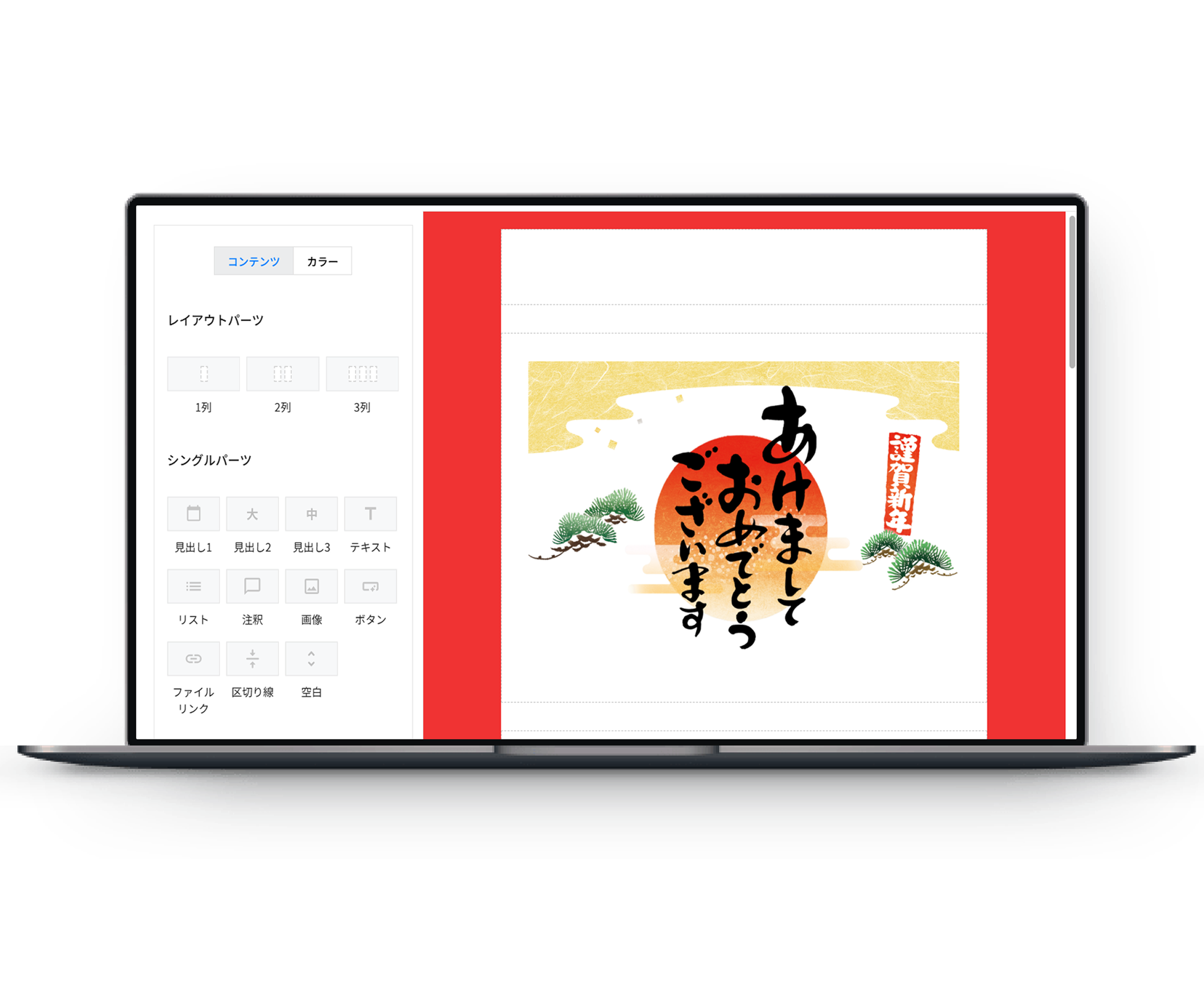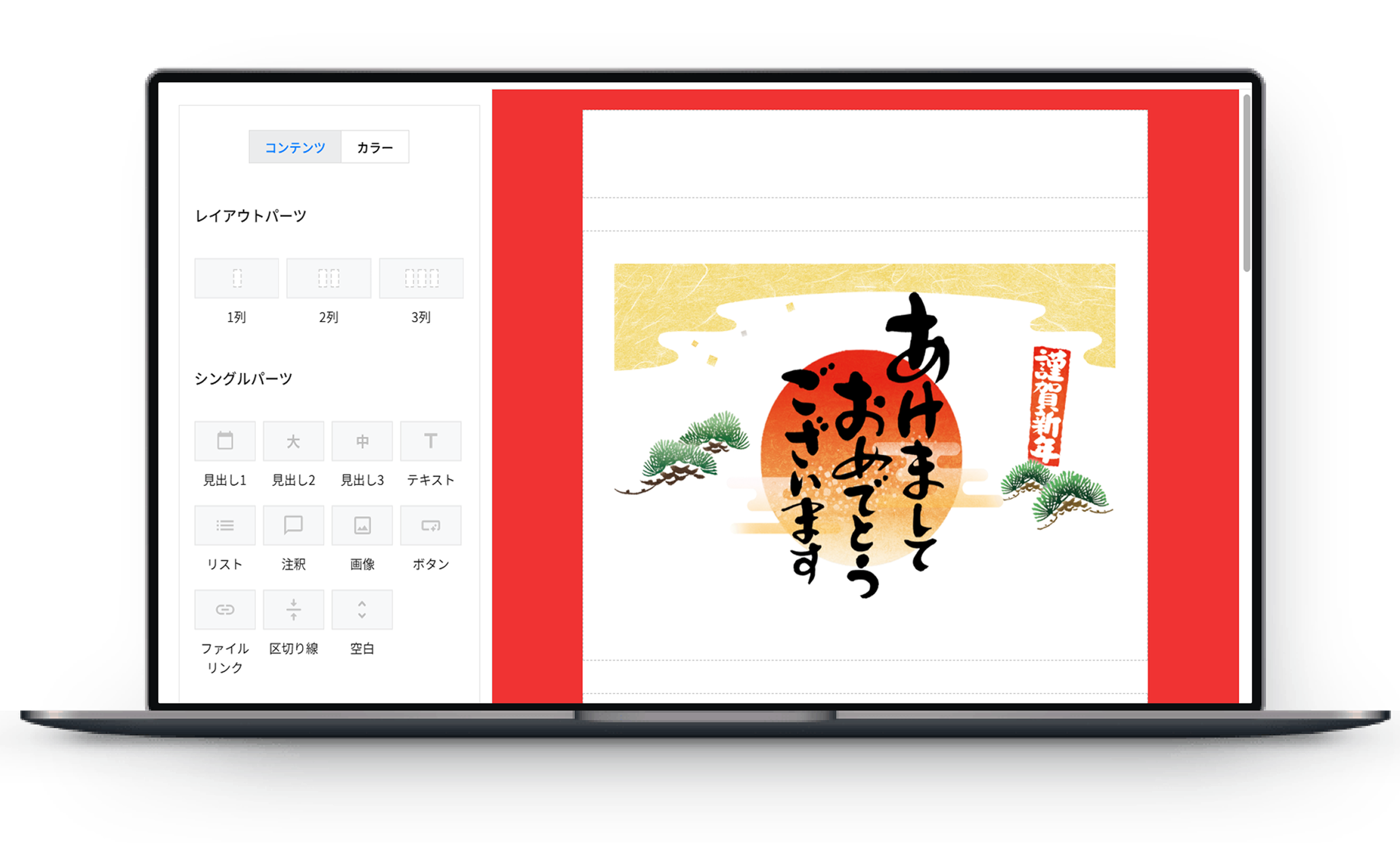 年賀用のテンプレートもあるため、印象的な年賀メールを短時間で、コードに触れることなく作成できます。
